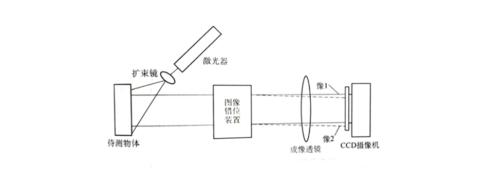 错位散斑干涉法是一种共光路、自参考的干涉测量法。激光通过光图像错位装置实现分束功能,并经过光学透镜在CCD的光敏面上形成物体的两个相互错位的像,两个互相错位的像相互干涉产生一个由物体表面形貌确定的散斑图,该散斑图随着物体表面的变形而变化。